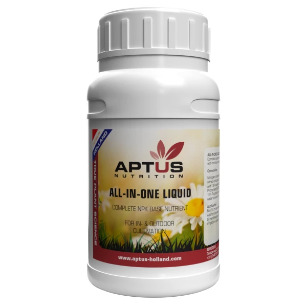 Een volledig minerale meststof geschikt voor alle mediums en systemen. All-in-One Liquid is te gebruiken vanaf de vegetatieve fase tot de bloei-/afrijpingsfase. Door het unieke productieproces is All-in-One Liquid eenvoudig in gebruik omdat deze niet gevoelig is voor pH-schommelingen en inzetbaar is in een groot pH-bereik.