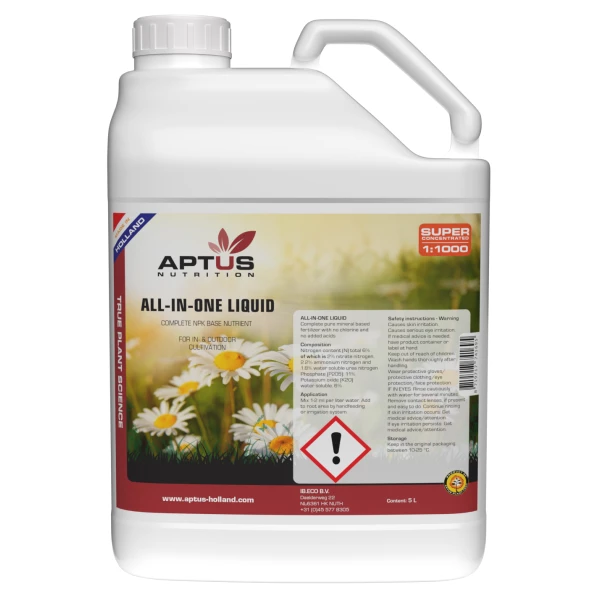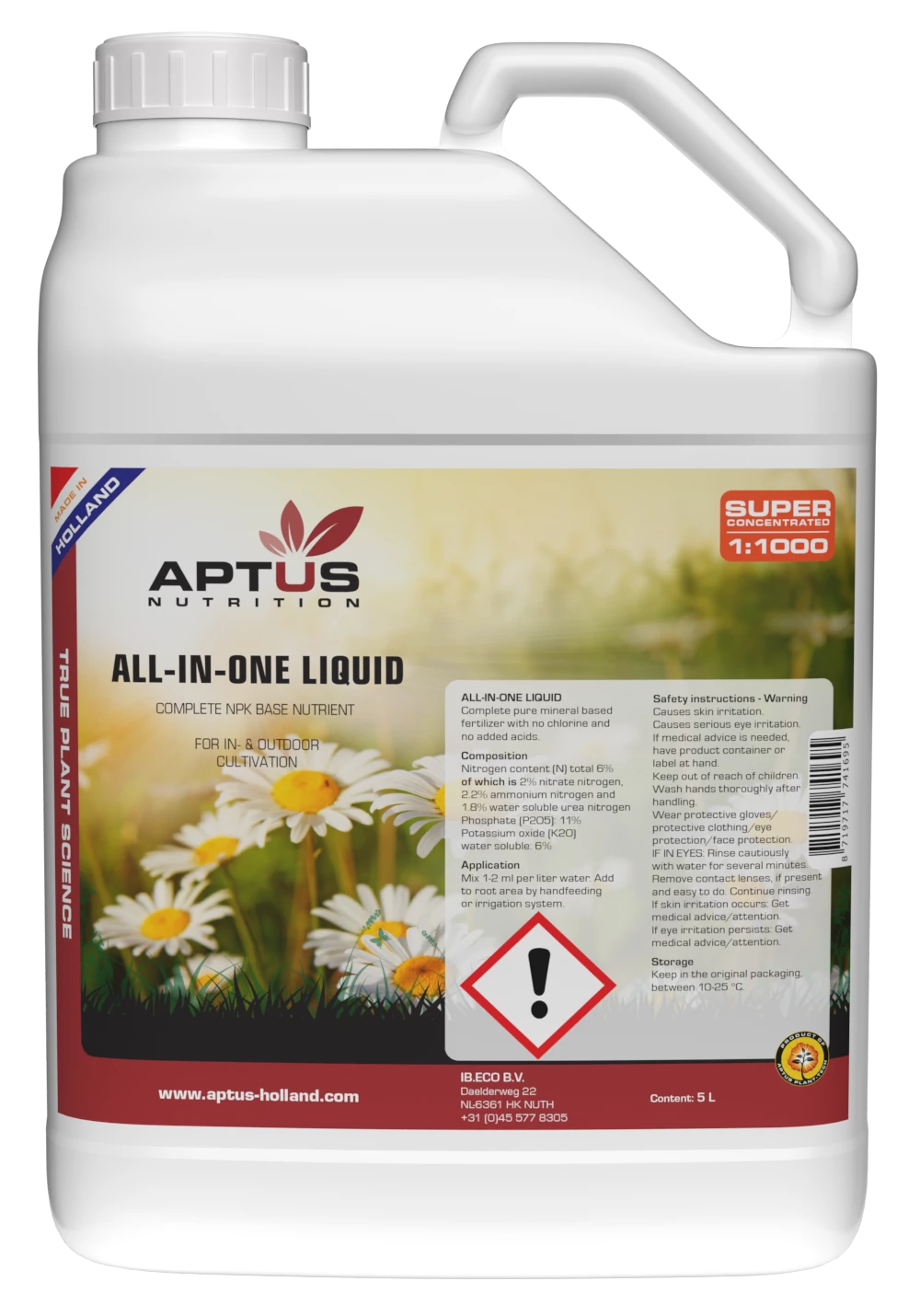 Een volledig minerale meststof geschikt voor alle mediums en systemen. All-in-One Liquid is te gebruiken vanaf de vegetatieve fase tot de bloei-/afrijpingsfase. Door het unieke productieproces is All-in-One Liquid eenvoudig in gebruik omdat deze niet gevoelig is voor pH-schommelingen en inzetbaar is in een groot pH-bereik.