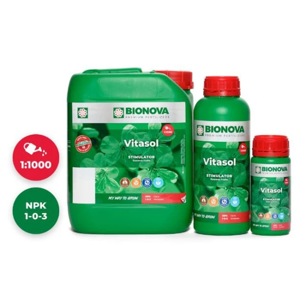 Bio Nova BN Vitrasol 5 liter Organische bodemverbeteraar Bio Nova VitaSol is een vloeibare organische bodemverbeteraar op kalibasis (5%) en van plantaardige oorsprong. Hierdoor wordt Bio Nova VitaSol gemakkelijk door de plant opgenomen en is uitermate geschikt als omzetter van aanwezige plantenvoeding, met kali als toevoeging.