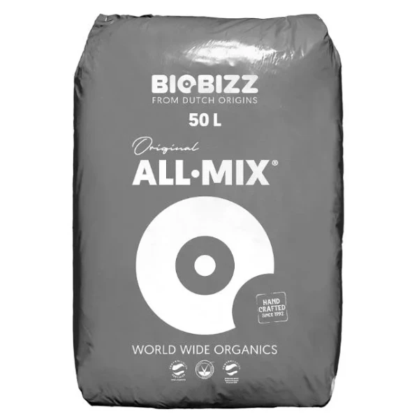BioBizz Allmix 50 liter – Biologisch Biobizz All-Mix is een organisch substraat en is ontwikkeld om te gebruiken als basis voor organisch kweken. De speciaal samengestelde grond bootst het ecosysteem na. Op deze manier heeft het voldoende kracht om plantengroei een paar weken te onderhouden zonder toevoeging van extra mest.Met All-Mix heb je het gehele jaar door, vruchtbare grond.Bevochtig de All-Mix voor het eerste gebruik en laat het 36 uur staan om de actieve PreMix mest en zijn micro-organismes op gang te laten komen voor de plant erin geplant wordt.