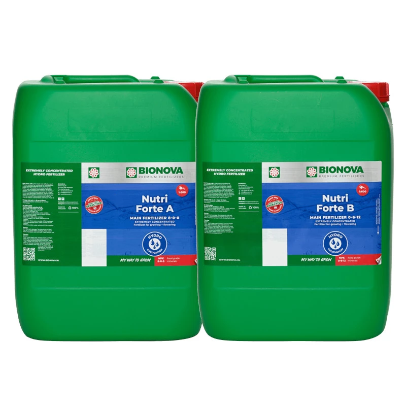 Bionova Nutri Forte A+B is de meest kosteneffectieve en eenvoudigste oplossing voor de teelt in hydrocultuur op kunstmatige substraten zoals steenwol, kleikorrels en perliet. Dit product bevat nauwelijks ballastzouten om verstoppingen in druppelsystemen te voorkomen. Deze combinatie bevat alle voedingswaardige mineralen en sporenelementen voor een snelle groei en uitbundige bloei. Planten nemen direct alle voedingswaardige mineralen op, waardoor u optimale controle over uw planten krijgt. Nutri Forte A moet worden gebruikt in combinatie met Nutri Forte B