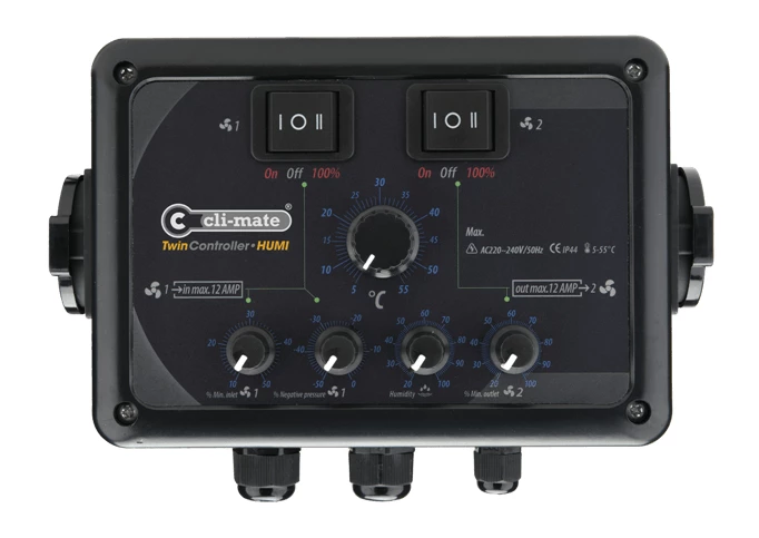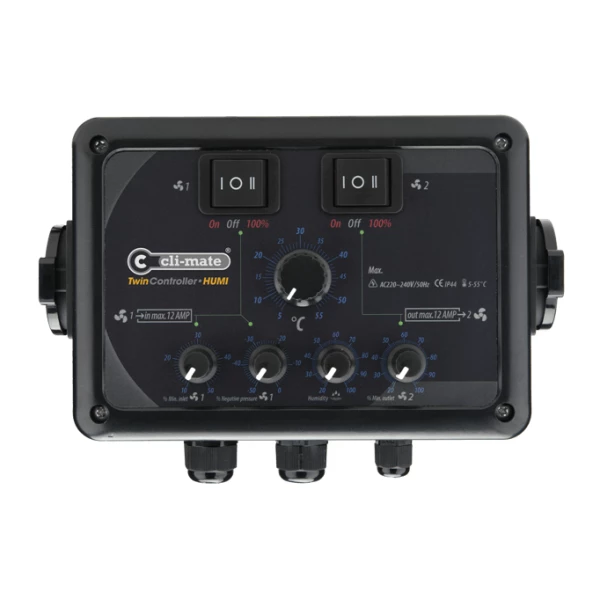 De Cli-Mate Twin-Controller 4 4 AMP is een temperatuur- en ventilatieregelaar in n, met twee instellingen voor de minimum snelheid en de onderdruk. De controller werkt volledig traploos en automatisch op temperatuur. In n stap regelt u alle aangesloten ventilatie-units.