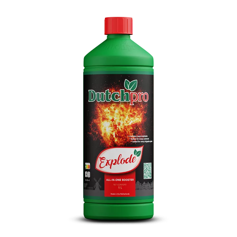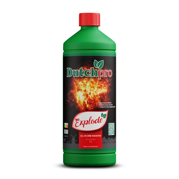 Dutch Pro Explode is de bloeistimulator bij uitstek, om de in volle bloei verkerende plant te voorzien in alle tekorten die zich in deze fase voordoen. Deze bloeistimulator, bestaande uit diverse geselecteerden spoorelementen, vitaminen en zuren, zorgt voor een explosieve uitharding van de toppen.