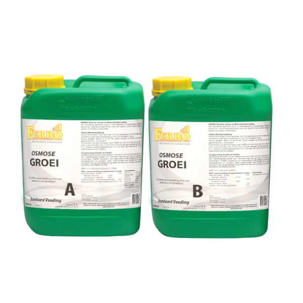 De Osmose GROEI A&B voeding is de voeding die gebruikt wordt tijdens de groeifase op aarde en hydro, met osmose- of regenwater als uitgangswater (het water waar de voedingsoplossing mee aangemaakt wordt). Tijdens deze fase veranderen de behoefte van de plant, alsmede de pH sturing in het substraat. Een perfecte twee componenten voeding voor je planten tijdens de groeifase. Osmose Groei A & Osmose Groei B.