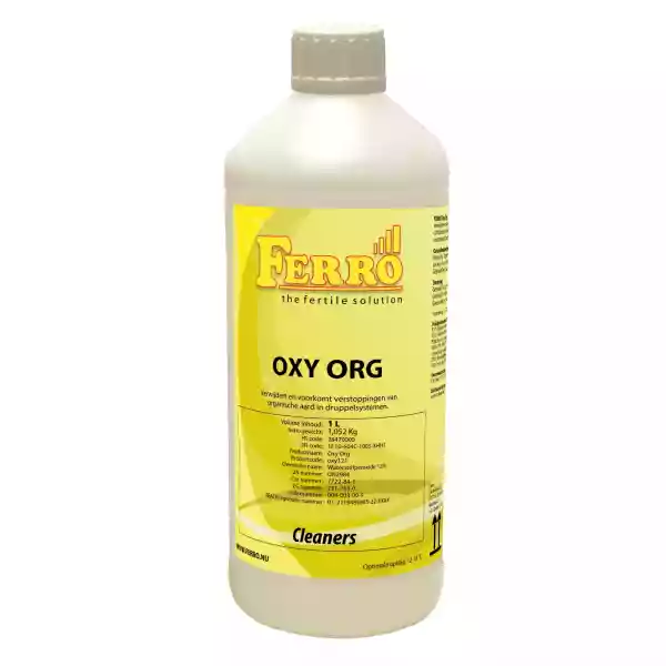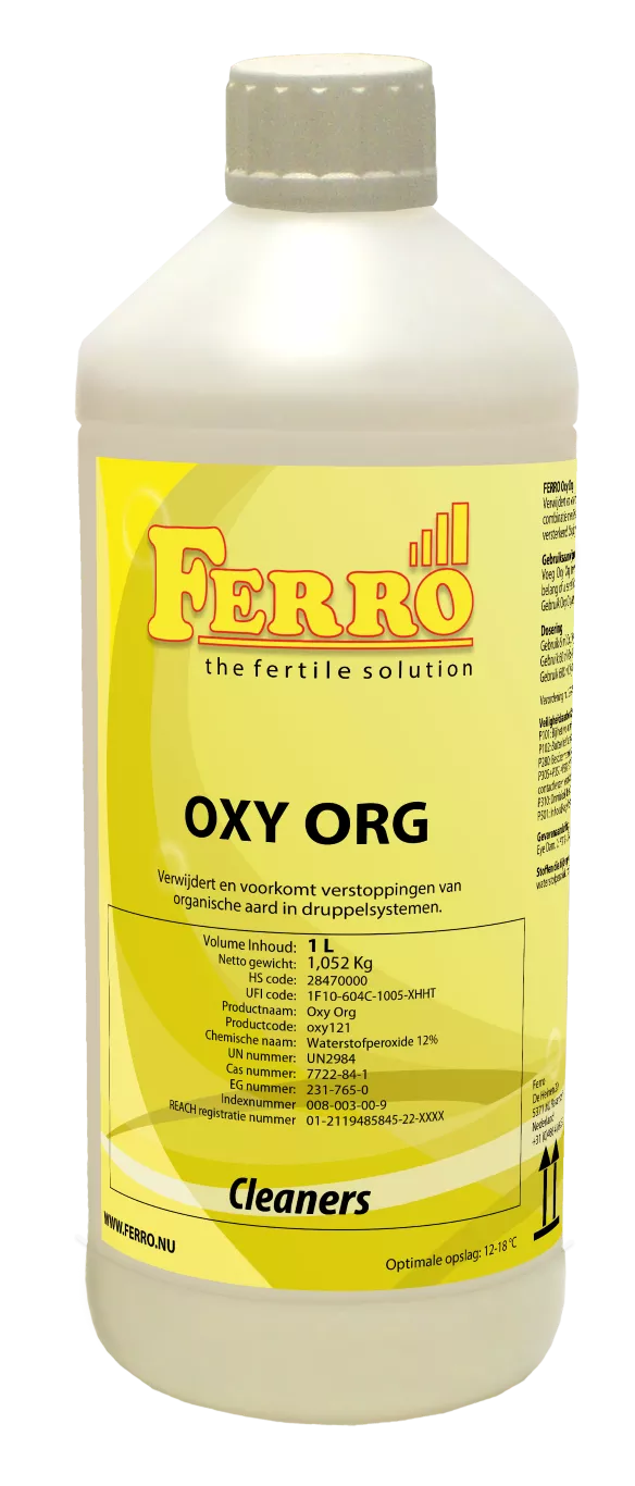 Ferro Oxy Org voorkomt verstoppingen in druppelsystemen Voorkomt verstoppingen van organische aard, verslijming en bacteriegroei in druppelsystemen. In combinatie met Ferro Drip Pro hebben beide middelen een synergerende werking indien op de juiste wijze samengevoegd.