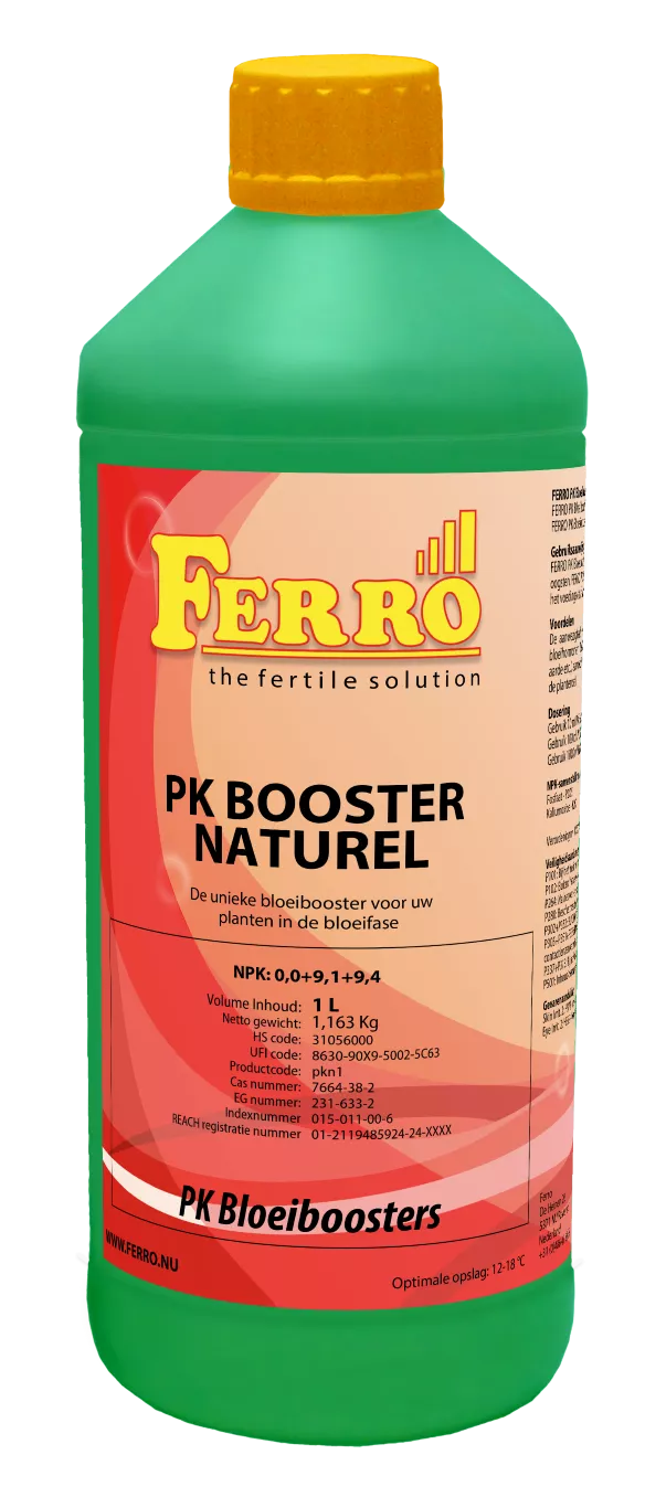 Ferro PK Booster Natural plantenvoeding 1 liter wordt toegepast tijdens de bloeifase van uw gewas. Tijdens de bloeifase hebben planten een grote behoefte aan fosfaten en kalium.