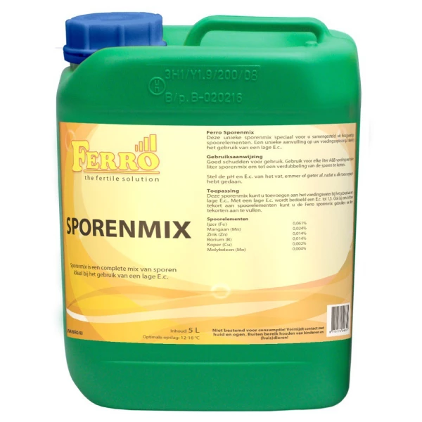 Sporenmix is, zoals de naam het al zegt een mix van diverse spoorelementen. Deze is speciaal ontwikkeld voor het werken met lage EC waardes. Bij het werken met een lage EC waarde is het uitermate belangrijk dat de spoorelementen worden aangevuld tot een optimaal niveau.