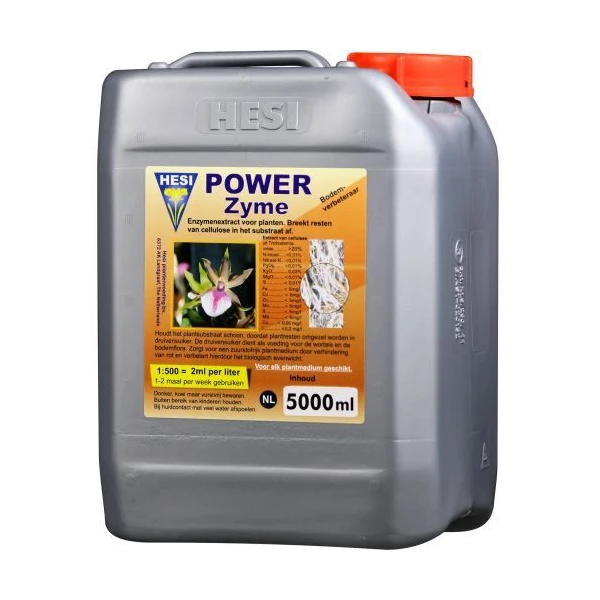 Hesi PowerZyme 5 liter Versterkt planten en verhoogt de weerstand Hesi PowerZyme zorgt voor een schoon en zuurstofrijk plantensubstraat. Versterkt de gewassen en stimuleert het wortelstelsel. Het verbetert de micro-flora en verhoogt de weerstand.