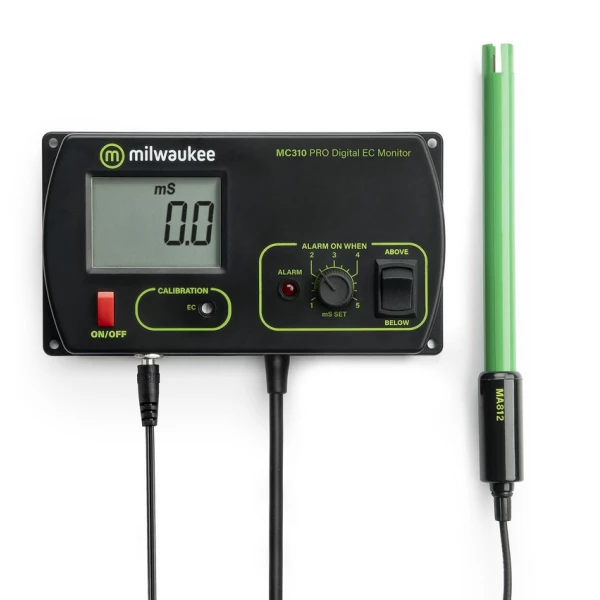 De MC-monitoren zijn ontworpen om de pH, EC en TDS waarden voortdurend te controleren direct in je reservoir. Een LED visueel alarm is geactiveerd en knippert wanneer de pH, EC en TDS stijgt boven of onder (gebruiker ingesteld) de set-point. Al deze instrumenten worden uitgevoerd op een 12V adapter dus hoeft u zich geen zorgen te maken over defecte accu’s. Elke unit wordt geleverd met een montage, sonde, sondehouder en starter kalibratie-oplossing. Specificaties: Bereik EC: 0.00 tot 10.00 mS/cm Resolutie EC: 0.1 mS/cm Nauwkeurigheid EC: 2% gehele bereik Set-point: 1.5 tot 3.5 mS/cm Alarm bij andere waarde dan ingestelde Set-point Electrode (vervangbaar): MA811/2 Batterij duur continu gebruik 300 uur