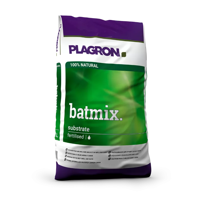 Plagron Batmix is samengesteld uit de allerbeste en uiterst zorgvuldig geselecteerde veensoorten. Door toevoeging van verschillende vezeltypen en perliet wordt een luchtigheid en zuurstofniveau bereikt zoals je dat alléén van Plagron kwaliteitsaarde kunt verwachten. De rijkelijk aanwezige Plagron wormenhumus garandeert een hoogstaand biologisch leven en een nog verdere verbetering van de watercapaciteit. De belangrijkste voedingsstof die aan de Batmix is toegevoegd is vleermuizenmest (bat guano). Vleermuizenmest is van nature rijk aan fosfor en kalium, dit garandeert een extreem uitbundige bloei. Alléén onder perfect gecontroleerde omstandigheden is bat guano te verwerken tot hét kwaliteitsproduct Batmix. Batmix levert de hoogste opbrengst in combinatie met Plagron Alga Grow, Alga Bloom en de additieven van Plagron.