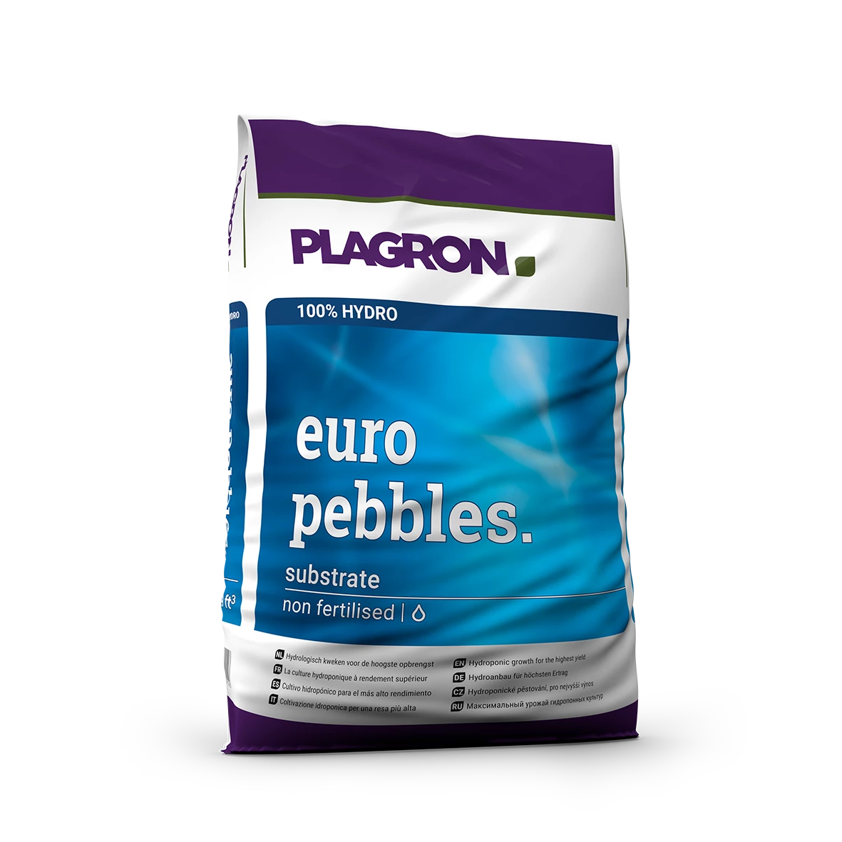Euro Pebbles is een inert hydrologisch substraat van hoge kwaliteit. Als grondstof worden zuivere en zoutvrije kleisoorten gebruikt die in een open oven gebakken worden tot de karakteristieke onregelmatige vorm. Euro Pebbles is breed toepasbaar doordat de voedingswaarde zelf te sturen is. Dit substraat is geschikt voor diverse kweekmethoden maar specifiek geschikt voor recirculerende systemen. Euro Pebbles is gewassen. Euro Pebbles levert de hoogste opbrengst in combinatie met Plagron Hydro A&B en de additieven van Plagron.